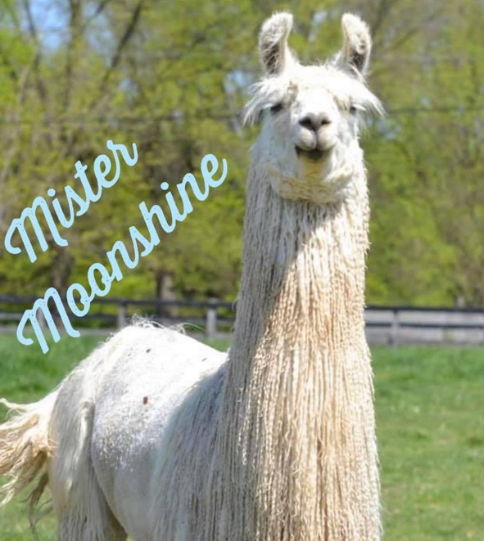 Mr. Moonshine: Mister Moonshine (Moonshine for short!) is a sweet boy who loves getting head scratches and giving kisses. His hobbies include munching on the greenest grass he can find and chasing his buddies around the pasture at the farm. Moonshine has been going to llama shows since he was a baby! His proudest accomplishment was getting Grand Champion at the Indiana State Fair in 2019!